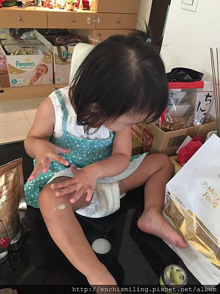 小艾瑪很愛塗抹東西在身上,哪裡癢癢就哪裡挖一大坨........